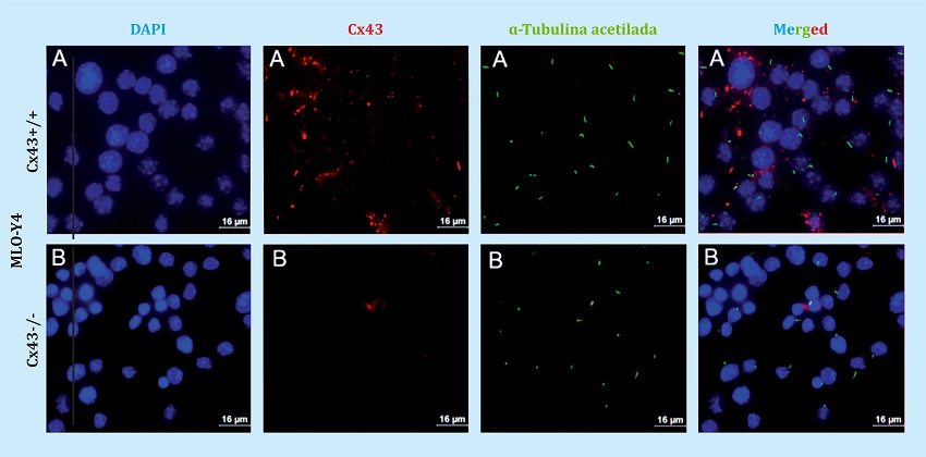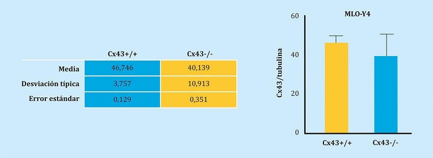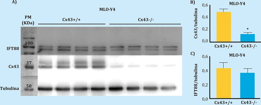 Material y métodos: Se comparó la línea celular de osteocitos MLO-Y4 control (Cx43+/+) con MLO-Y4 deficientes en Cx43 (Cx43-/-). El análisis de expresión de la proteína del transporte intraflagelar 88 (IFT88), de la Cx43 y de la fosforilación de la quinasa reguladora de la señal extracelular (P-ERK) se determinó mediante Western blot. Para caracterizar la posible colocalización entre el cilio primario y Cx43 se realizó una inmunofluorescencia. Para simular el estímulo mecánico in vitro, las células se sometieron a un estrés mecánico de 10 dinas/cm2 por flujo de fluido durante 10 minutos.