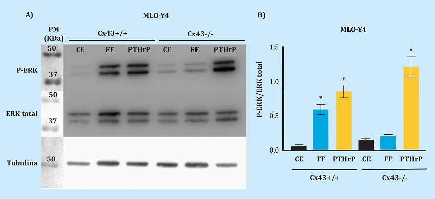 Asimismo, se analizó la respuesta celular de los osteocitos (fosforilación de ERK) tras estimular el PTH1R, tanto con PTHrP, obteniéndose un mayor aumento de P-ERK en las células Cx43-/- respecto a Cx43+/+, como mecánicamente, que produjo un aumento de la expresión de P-ERK independiente de la deficiencia en Cx43.