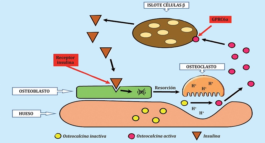 Los ratones que no tienen receptores de la insulina en los osteoblastos, cuando toman una dieta normal, sufren un descenso en la forma circulante activa de la osteocalcina, un descenso en la secreción de insulina, intolerancia a la glucosa y resistencia a la insulina. La señal de la insulina sobre los osteoblastos inhibe la expresión de osteoprotegerina y favorece la resorción ósea. El bajo pH que se produce bajo los osteoclastos favorece la formación de osteocalcina descarboxilada, que es la forma activa de la osteocalcina. Esta osteocalcina activa vuelve a actuar sobre las células β-pancreáticas y se forma nueva insulina que vuelve a actuar sobre el osteoblasto y comienza de nuevo el ciclo (Figura 2)15.