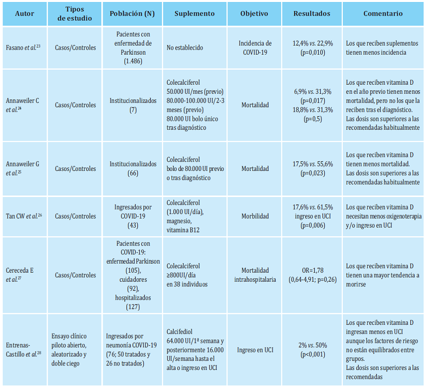 Sin embargo, las evidencias disponibles hasta ahora son muy escasas. Se han publicado varios estudios de casos/controles que podemos denominar cuasi-experimentales y un estudio piloto a partir de una cohorte de pacientes infectados con neumonía (Tabla 1). El tamaño muestral de los mismos es pequeño, salvo uno de ellos que incluyó 1.476 pacientes. Se han obtenido algunos resultados favorables, aunque debe tenerse en cuenta las limitaciones que presentan23-28. No hay datos sobre los valores de 25-hidroxivitamina D basales ni finales, aunque todos ellos valoran variables de resultado importantes, como incidencia de enfermedad y mortalidad.