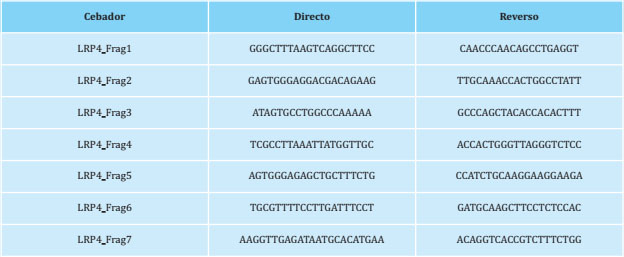 El ADN genómico de los casos de MCI y sus parientes y de las mujeres HBM se aisló de leucocitos de sangre periférica utilizando el kit de purificación de ADN genómico Wizard® (Promega, Madison, Wisconsin, EE.UU.), de acuerdo con las instrucciones del fabricante. En cuanto a la re-secuenciación, específicamente, hemos amplificado los exones que codifican para las mutaciones causantes del síndrome de Cenani-Lenz (p.D137N, p.C160Y, p. D449N, p. T461P, p.L473F, p. D529N, p.L953P, p.C1017R, p.R1277H, p.E1233K) y el tercer dominio β-propeller donde se localizan las mutaciones causantes del síndrome miasténico y de la esclerosteosis. La amplificación de cada uno de estos fragmentos se hizo mediante reacción en cadena de la polimerasa (PCR) usando GoTaq Flexi DNA polymerase (Promega). Los fragmentos de PCR fueron analizados mediante electroforesis en gel de agarosa y su purificación se hizo en MultiScreenTM Vacuum Manifold 96-well plates (Merck Millipore). Los productos de PCR purificados fueron secuenciados mediante el método de Sanger en el servicio de genómica del CCiTUB (Genómica, Parc Científic, Barcelona, España). El kit de marcado utilizado fue BigDye™ Terminator v3.1 Cycle Sequencing Kit (ThermoFisher), la detección y la electroforesis se realizaron en los secuenciadores capilares automáticos 3730 Genetic Analyzer y 3730xl Genetic Analyzer (ThermoFisher). El diseño de los cebadores se basó en la secuencia consenso ENSG00000134569 (LRP4; GRCh37.p13) y la secuencia de los mismos se presenta en la tabla 1.