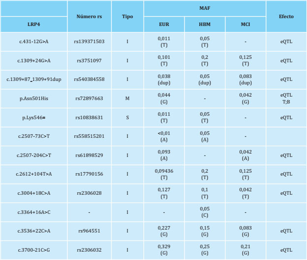 En la re-secuenciación de LRP4 hemos identificado 12 variantes, de las cuales una es una variante no descrita anteriormente (c.3364+16A>C; tabla 2). Esta variante se ha encontrado en heterocigosis en la mujer HBM2 que presenta una suma de Z-score (columna y fémur) de 4,6. Seis de las 12 variantes identificadas se encuentran tanto en la cohorte de mujeres con fenotipo HBM como en la cohorte de pacientes con MCI, con una frecuencia similar en ambas cohortes a la de población europea. Además, hemos encontrado 4 variantes solamente presentes en la cohorte HBM y 2 variantes únicamente presentes en la cohorte MCI. Todas las variantes descritas, exceptuando rs558515201 y la variante c.3364+16A>C, aparecen como eQTL de diferentes genes y tejidos en la base de datos GTEx. En concreto las variantes rs17790156, rs61898529, rs2306028, rs964551 y rs2306032 son eQTL de LRP4.