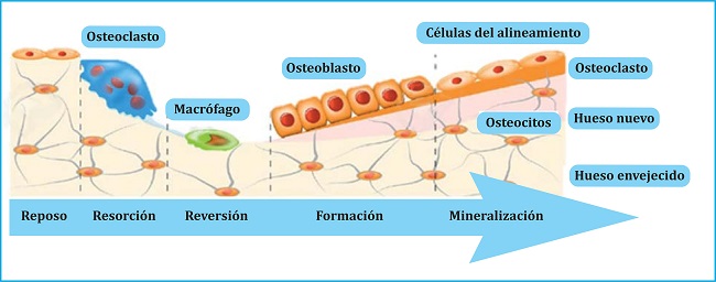 La interacción permanente entre el hueso y el sistema inmune es de gran importancia en el mantenimiento de la homeostasis ósea y también es clave en la patología ósea. Durante toda la vida adulta, se produce la remodelación ósea en las unidades básicas multicelulares (multicelular basic units [MBU]) o unidades de remodelado óseo donde los osteoclastos reabsorben una cantidad determinada de hueso y los osteoblastos forman la matriz osteoide y la mineralizan para rellenar la cavidad previamente creada (Figura 1). En las MBU hay osteoclastos, macrófagos, preosteoblastos y osteoblastos que están regidos por una serie de factores, tanto generales como locales, permitiendo el funcionamiento normal del tejido óseo y el mantenimiento de la masa ósea.