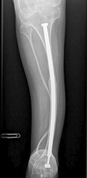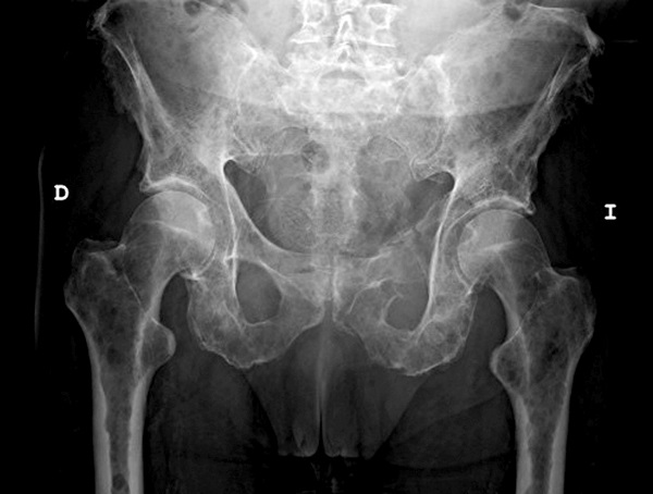 Una densitometría ósea realizada a los 15 años de edad, demostró una densidad mineral ósea lumbar (DMO) de 0,474 g/cm2 (Z-score: -6,43). Se trató con zolendronato durante una década, mejorando su DMO lumbar hasta 0,854 g/cm2. Pero, tras un año de abandonar el tratamiento, sufrió una fractura atípica diafisaria femoral, siendo entonces referido a nuestro servicio.