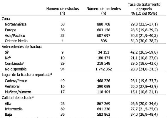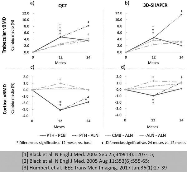 Resultados: Se obtuvo una muestra de 102 pacientes, 74 (72,5%) en el G1 frente 28 (27,5%) del G2. Los grupos fueron similares en las características basales, incluyendo los valores de DMO y la prevalencia de fracturas. A los 12 meses, el G1 incrementó la DMO +4,02% (IC95%: 2,2 a 5,9; p=0,005) a nivel de vertebral y +3,96% (IC95%: 0,8 a 7,1; p=0,036) a nivel femoral, frente a -0,64% (IC95%: -3,5 a 2,2; p=0,200) y -0,12% (IC95%: -5,1 a 4,9; p=0,373) en el G2. Se produjeron 7 (9,5%) y 6 (21,4%) fracturas en el G1 y G2, respectivamente. El riesgo de fractura fue 2,27 veces mayor (IC95%: 0,8 a 6,2; p=0,106) en el G2.
