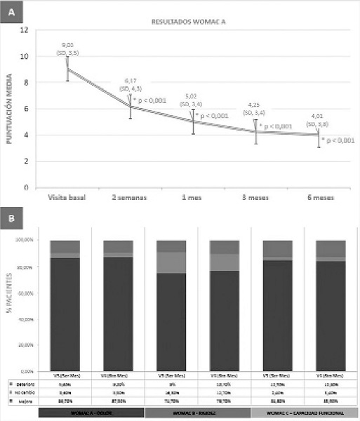 Resultados: Se reclutaron 189 pacientes; 166 pacientes a los 3 meses para eficacia y 150 a los 6 meses para la evaluación de la eficacia. Se observó una reducción estadísticamente significativa (p<0,0001) de la puntuación WOMAC-A a los 3 meses respecto a la visita basal: 4,25 vs 9,03 (52,9% de reducción) (figura A). A los 6 meses, el nivel de dolor continuó disminuyendo a lo largo del estudio. La puntuación del dolor en movimiento, la rigidez articulas y la capacidad funcional mejoraron significativamente un 52,66% (WOMAC-A1), 54,20% (WOMAC-B) y 51,60% (WOMAC-C) respectivamente. La mayoría de pacientes mejoró las puntuaciones de las subescalas WOMAC (figura B). El 1,6% de los pacientes informaron de eventos adversos locales de intensidad leve.