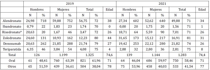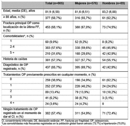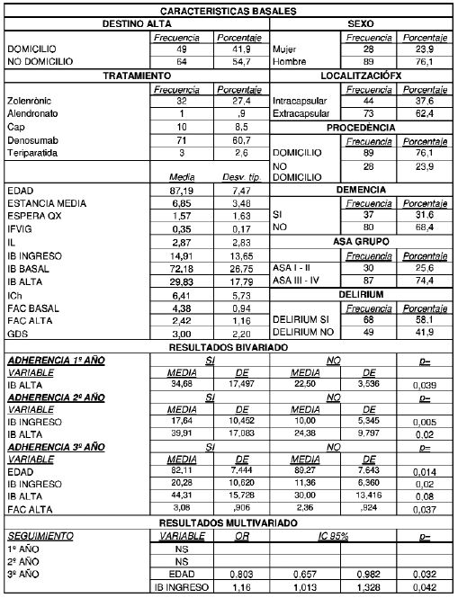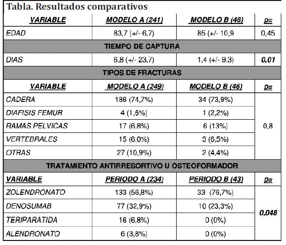 El periodo A, obtuvo 249 fracturas, media 83,7 años, 56 hombres y 185 mujeres, tiempo medio de captura (t1/2) 6,8 días, tipos de fractura tabla. Tratamiento: zolendronato 133 (56,8%) denosumab 77 (32,9%) teriparatida 16 (6,8%). Otros 6 (3.8%).