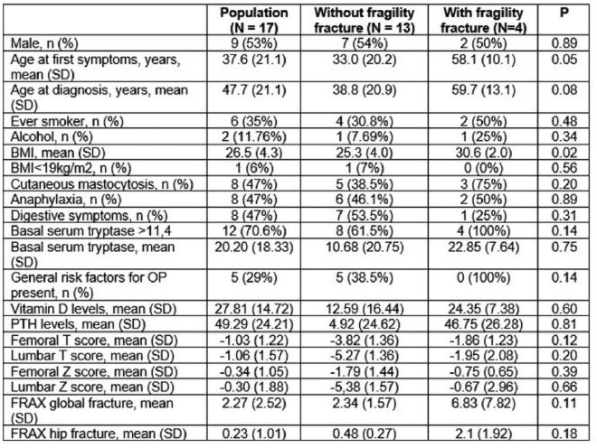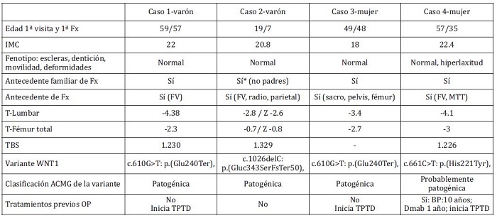 Resultados: El 79% de las pacientes tenía antecedentes de fracturas por fragilidad, 76% tenían AFOP, 52 % tenía un IMC <20, 35% presentaba hiperlaxitud articular a la exploración física y 33% valores de FAT bajos. El 43% de las pacientes tenía hipercalciuria (31% con litiasis renal asociada). En 20 (61%) pacientes se realizó estudio genético para valoración de osteogénesis imperfecta (OI) y/o hipofosfatasia. En el 30% de estas pacientes se observaron variantes genéticas asociadas: COL1A1 (1 paciente), COL1A2 (2 pacientes), ALPL (1 paciente), LRP5 (1 paciente) y WNT1 (1 paciente), ninguna de ellas presentaba fenotipo de OI (2 pacientes con hiperlaxitud). Solo 1 de las pacientes con disminución de la FAT presentó mutación en ALPL (fue la única con valores de FAT <25 U/l).
