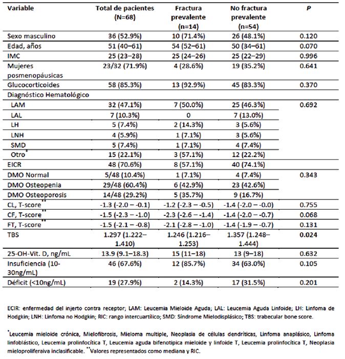 Objetivo: Determinar valores densitométricos en columna lumbar (CL) y cadera (CF) para estimar la frecuencia de OP y analizar factores asociados a menor densidad mineral ósea (DMO).