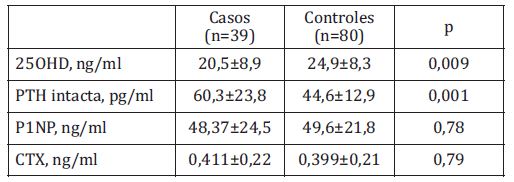 Resultados: Se analizaron 119 mujeres, 39 casos y 80 controles, con una media de edad de 50 años. El 56,4% de los casos tenia niveles de 25OHD en rango de deficiencia (<20 ng/ml) frente al 27,5% de los controles (p=0,002). Se encontraron niveles más bajos en el grupo de mujeres con MCR (tabla) y las diferencias se mantuvieron tras ajustar por la edad, el IMC y el mes del año (p=0,02). Se observó una correlación inversa entre los niveles de 25OHD y los días de cefalea al mes (r=-0,383; p=0,044). La siguiente tabla muestra los resultados de los parámetros de metabolismo óseo.
