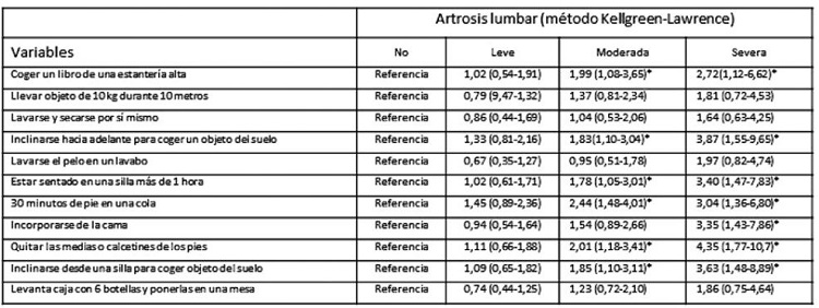 La fuerza de agarre en ambas manos disminuyó significativamente con la artrosis severa (p<0,001), pero la asociación se perdió al ajustar por edad y sexo. Por contra, tras ajustar por edad y sexo, la presencia de artrosis severa se asoció de forma significativa con dificultades o incapacidad para realizar 7 de las 11 actividades de la vida cotidiana (ver tabla). Aunque con menor grado de asociación, la artrosis lumbar moderada se asoció con 6 de las 11 actividades. La presencia de artrosis leve no se asoció con ninguna de las actividades analizadas.