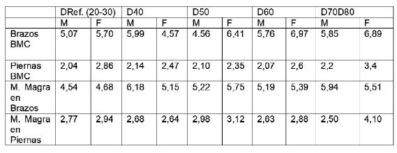 Resultados: La asimetría expresada como % de cambio entre dominante y no dominante -brazos (Der. e Izq.) y piernas (Der. e Izq)- Los números en negrita indican diferencias significativas (p <0.05) (tabla). Los hombres ,mostraron diferencias mâs notorias, significativas excepto en D20-D30, en este grupo encontramos que las mujeres tenían asimetría de BMC de las piernas. La masa magra fue significativamente diferente por sexo en las décadas D70D80.