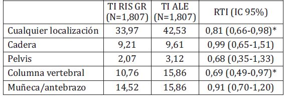 Resultados: Se incluyeron 1.807 pacientes en cada cohorte (mediana de edad: 60 años; período medio de seguimiento [anos]: RIS GR: 4,3, ALE: 4,6). La TI de las fracturas fue significativamente menor en la cohorte de RIS GR frente a la de ALE en cualquier localización (RTI: 0,81, p<0,05) y para las fracturas de columna vertebral (RTI: 0,69, p<0,05) (ver tabla). Se observaron tendencias de menor incidencia de fracturas en la cohorte GR para las otras localizaciones anatómicas evaluadas (ver tabla). En comparación con la cohorte de ALE, en la cohorte de RIS GR se observó un menor número de hospitalizaciones (TI, RIS GR: 112,03; ALE: 134,69; RTI: 0,85, p<0,05) lo que se tradujo en costes de hospitalización inferiores (promedio por paciente por año; RIS GR: $3.605; ALE: $4.572, p=0,0681).