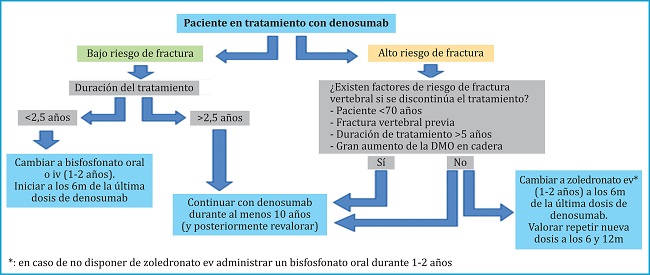 La discontinuación de denosumab tiene consecuencias claramente negativas para el hueso, y solo los bisfosfonatos, por tener un efecto antirresortivo residual, podrían discontinuarse durante un tiempo limitado (vacaciones terapéuticas).