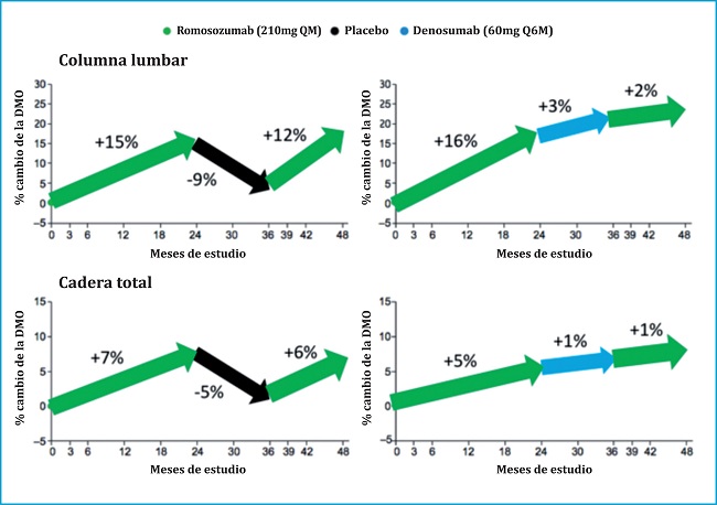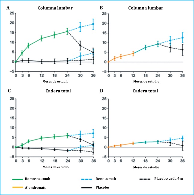 La secuencia DMAB‐ROMO podría ser más favorable, pues se ha reportado que un segundo ciclo de 12 meses de ROMO en pacientes que habían recibido 12 meses de DMAB después de un primer ciclo de 2 años de ROMO sí que consigue aumentar la DMO de columna lumbar (2,3%) y mantener la DMO de cadera (figura 5)47. Sin embargo, hay que tener en cuenta que estos resultados se han extraído de una cohorte de tan solo 14 pacientes, y en los que DMAB solo había sido administrado durante un año.