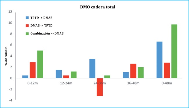 La terapia combinada más prometedora es la administración simultánea de TPTD y DMAB. En el estudio DATA‐Switch se observó como las pacientes tratadas con la combinación presentaban mayores aumentos de DMO en columna y cadera que las pacientes tratadas con cada fármaco en monoterapia (figura 4)44.