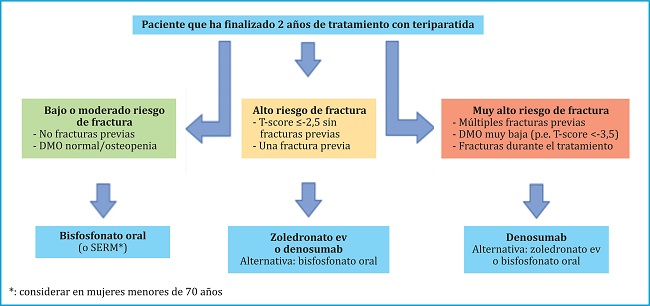 En función de las características clínicas del paciente y del riesgo de fractura podríamos seleccionar un antirresortivo u otro tras finalizar los dos años de tratamiento con TPTD (figura 6).