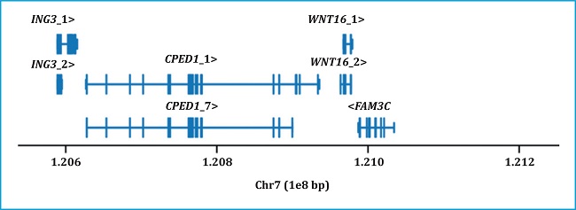 Multitud de estudios de asociación del genoma completo (GWAS) han mostrado asociación entre el locus que contiene WNT16 y varios fenotipos esqueléticos, incluyendo la DMO y el riesgo de fracturas2,3,13-26. WNT16 se encuentra en un locus muy complejo, donde varios genes de la región han mostrado un papel importante sobre el metabolismo óseo. Pertenecen a este locus los genes ING3 y CPED1 a 5 y FAM3C a 3 de WNT16 (figura 1).