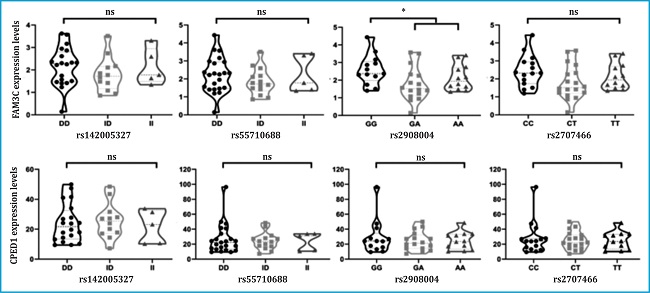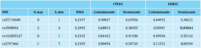 Las variantes rs2908004, rs2707466, rs55710688 y rs142005327 de WNT16 han sido descritas como cis-eQTLs, según la base de datos GTEx en diferentes tejidos humanos (tabla 2). Desafortunadamente, esta base de datos no dispone de información de ningún tejido óseo. Es por esto, que haciendo uso de una base de datos propia de osteoblastos primarios humanos (n=45), hemos testado si estas variantes actúan como cis-eQTL de los genes vecinos de WNT16: CPED1 y FAM3C. Únicamente la variante rs2908004 ha mostrado una asociación significativa con los niveles de expresión de FAM3C bajo la hipótesis dominante (p=0.03, tabla 3, figura 2). Además, las variantes rs2908004 y rs2707466 muestran una tendencia a la significación con los niveles de expresión de FAM3C bajo la hipótesis de codominancia (p=0.05491) y bajo la hipótesis dominante (p=0.06954), respectivamente (tabla 3, figura 2). La presencia del alelo G (rs2908004) y el alelo C (rs2707466) están asociados con un aumento en la expresión de FAM3C (tabla 3, figura 2). Por el contrario, no hemos encontrado asociación significativa ni tendencia entre las variantes analizadas de WNT16 y los niveles de expresión de CPED1 (tabla 3, figura 2).