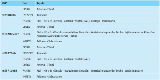 La relación de los genes presentes en el locus ING3-CPED1-WNT16-FAM3C con el metabolismo óseo y su repetida asociación a la DMO plantea la cuestión de si hay un único gen causal y, en ese caso, cuál es o, si por lo contrario, todos los genes están contribuyendo al fenotipo. Para ello, en el presente trabajo hemos determinado si aquellas variantes de WNT16 asociadas a la DMO en un trabajo previo de nuestro grupo32 se encuentran modificando la expresión de los genes vecinos CPED1 y FAM3C.