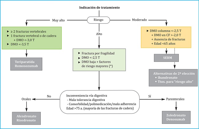 El principal criterio para la elección del fármaco inicial es el nivel de riesgo de fractura: