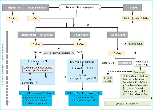 Si no se da ninguna de estas circunstancias, el tratamiento con BP puede retirarse, al menos temporalmente («vacaciones terapéuticas»). Durante 1 año el risedonato; 2 el alendronato, y 3 el zoledronato. En el caso del denosumab no se deben plantear interrupciones temporales.