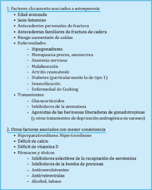Los principales factores de riesgo se exponen en la tabla 1. Tras sufrir una primera fractura, el mayor riesgo de sufrir una nueva fractura se da en los dos años siguientes, sobre todo si la primera fractura fue vertebral2. Esto ha llevado a formular el concepto de «riesgo inminente» de fractura.