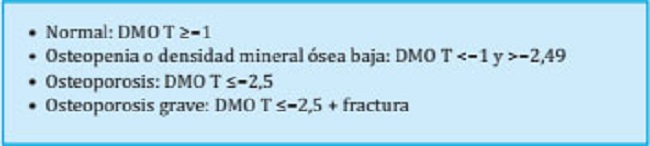 La absorciometría por rayos X (DXA), que cuantifica la densidad mineral ósea (DMO), es el procedimiento habitualmente utilizado para estimar el riesgo de fractura. Se establece el diagnóstico de osteoporosis con un índice T <-2,5 en cualquiera de las siguientes localizaciones: columna lumbar, cadera total o cuello femoral (tabla 2).