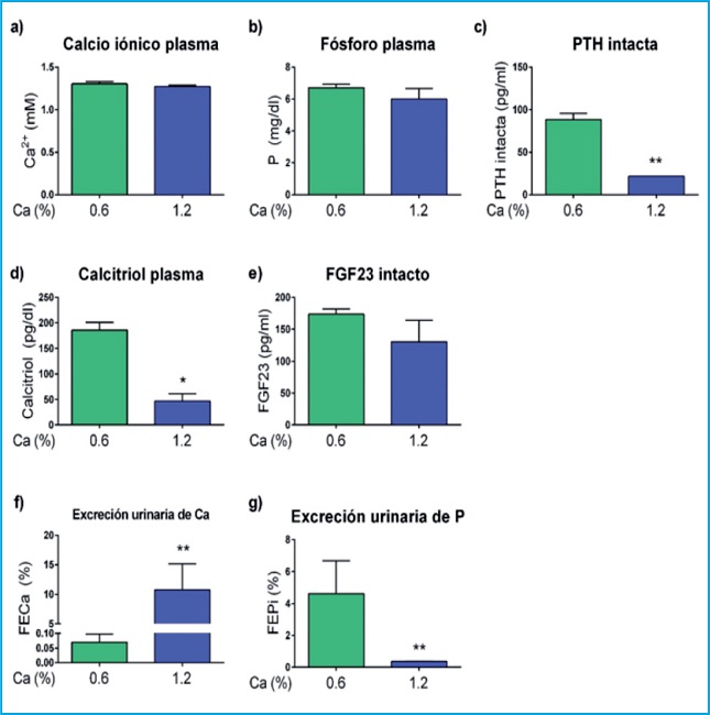 El grupo de animales alimentado con una dieta rica en calcio mostró niveles plasmáticos de calcio y fósforo similares a los del grupo alimentado con calcio normal (figura 1 a y b respectivamente). Sin embargo, la dieta con alto contenido de calcio produjo tanto una disminución de la concentración plasmática de PTH intacta (figura 1 c) como de calcitriol (figura 1 d). Los niveles de FGF23 intacto permanecieron similares en ambos grupos (figura 1 e). Como se esperaba, el análisis de orina de 24h mostró un incremento de la calciuria y una disminución de la fosfaturia en las ratas alimentadas con dieta rica en calcio (figura 1 f y g respectivamente).
