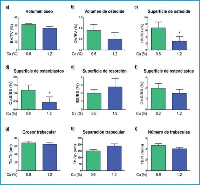 El volumen de hueso trabecular y el volumen de osteoide de las ratas alimentadas con dieta rica en calcio permanecieron similares respecto al de las ratas alimentadas con una dieta normal de calcio (figura 2 a y b), mientras que se observó una reducción significativa de la superficie de osteoide (figura 2 c) en el grupo de animales alimentados con dieta rica en calcio, que fue consistente con una disminución de la superficie de hueso cubierta por osteoblastos (figura 2 d). Tanto la superficie de re-sorción como la superficie de hueso cubierta por osteoclastos fueron similares en ambos grupos (figura 2 e y f respectivamente). A nivel de micro-arquitectura trabecular no se observaron diferencias respecto al grosor trabecular, separación trabecular y número de trabéculas (figura 2 g, h, i).