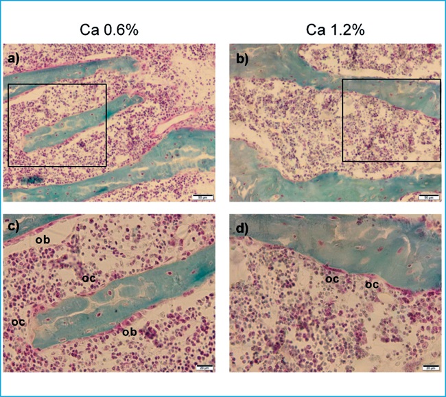 En modelos animales, la mayoría de los estudios sobre los efectos óseos asociados al calcio están desarrollados en modelos en los que se reducen los niveles de vitamina D, bien a través de dietas deficientes en vitamina D o bien en animales knockout para el receptor de vitamina D (VDR). En ratas wistar macho alimentadas con una dieta deficiente en vitamina D desde estadios prenatales, se ha demostrado que una dieta deficiente en vitamina D disminuye la densidad mineral ósea, la longitud del fémur y provoca alteraciones histológicas como acumulación de osteoide, aumento de actividad osteoblástica o disminución de actividad osteoclástica. Cuando estas ratas con una dieta deficiente en vitamina D fueron alimentadas con un suplemento de calcio en la dieta, se recuperó parcialmente la densidad mineral ósea, y la longitud de la tibia, disminuyó el volumen de osteoide y la actividad osteoblástica, mientras que aumentó el número de osteoclastos, lo que produjo una disminución del volumen óseo trabecular5. En otro estudio similar, animales alimentados con dieta deficiente en vitamina D disminuyeron el contenido de calcio en el hueso, que fue reestablecido con la infusión de calcio y fósforo indicando que los efectos de la vitamina D sobre el hueso deben ser principalmente indirectos y derivados de su función sobre la regulación del metabolismo mineral6.