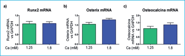 Para estudiar in vitro el efecto directo del calcio sobre los osteoblastos utilizamos la línea de células osteoblásticas de rata UMR-106. El medio de cultivo de estas células fue suplementado con calcio hasta alcanzar una concentración de 1,8 mM y se comparó con células cultivadas con medios de cultivo con contenido normal de calcio (1,25 mM). Tras 48h de tratamiento, se observó que los altos niveles de calcio no modificaron la expresión de genes osteogénicos como Runx2, Osterix u Osteocalcina (figura 4 a, b y c respectivamente).