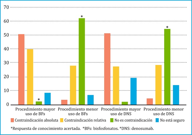 Al evaluar el riesgo de desarrollar ONM, 50,2% de los encuestados consideraron que el uso de BFs era una contraindicación absoluta para un procedimiento odontológico mayor, mientras que 51,3% consideraba lo mismo para denosumab. Para procedimientos menores el 3,2% de los encuestados consideraron que el uso de bisfosfonatos era una contraindicación absoluta y el 27,8% una contraindicación relativa para realizar el procedimiento. Los porcentajes para el uso de denosumab fueron 4,2% y 28,3% respectivamente (figura 1).
