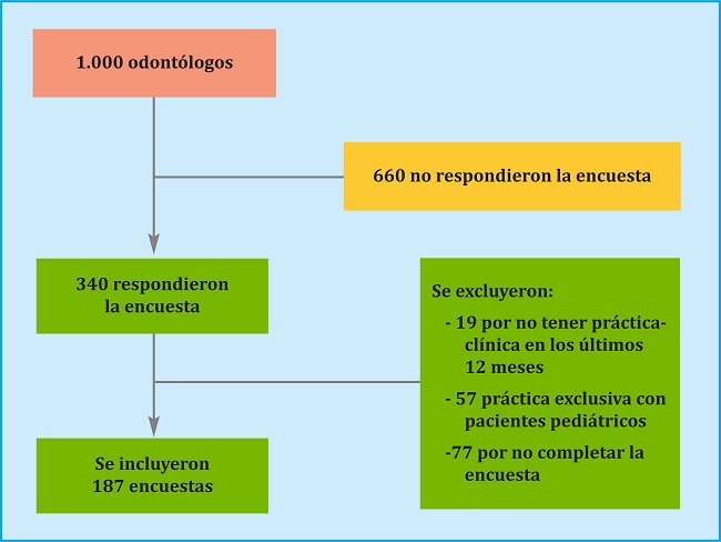 La encuesta se alojó en el programa Survey Monkey (suplemento 1), y fue enviada a odontólogos, cirujanos maxilofaciales, periodoncistas y rehabilitadores orales, afiliados a la Federación Odontológica Colombiana, durante el periodo de octubre del 2019 a agosto del 2020, se invitaron a participar con el envío de correo electrónico registrado por cada profesional, hasta un máximo de 3 veces. Se excluyeron los profesionales que reportaron ausencia de práctica clínica en un año y aquellos con dedicación exclusiva a pacientes pediátricos.
