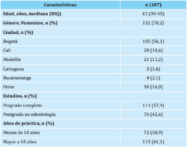 1.000 odontólogos colombianos fueron invitados a participar. 340 (34%) respondieron la encuesta, y de ellos 19 (5,5%) fueron excluidos por no tener práctica clínica en los últimos 12 meses, 57 (16%) por práctica exclusiva con pacientes pediátricos y 77 (22%) porque no completaron la encuesta. En total se analizaron las respuestas de 187 odontólogos (algoritmo 1). La mediana de edad fue de 42 años (rango intercuartílico 39-45). La mayoría fueron mujeres (70,2%), con mayor presencia de odontólogos de Bogotá (56,2%). En la tabla 1 se presentan las características demográficas del grupo de odontólogos que participaron en el estudio.