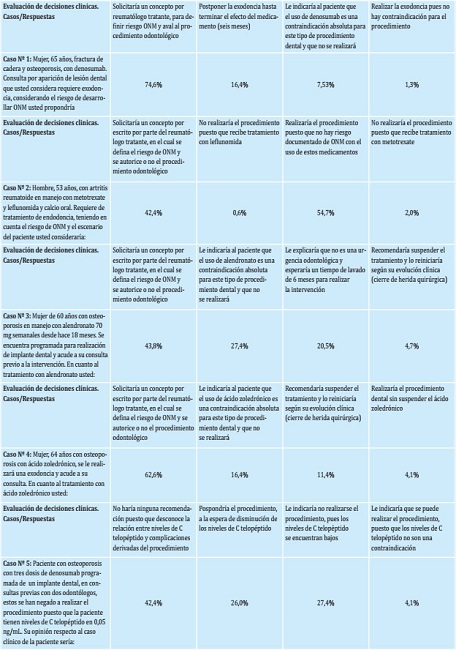 Para el caso 1 (Mujer de 65 años con fractura de cadera y osteoporosis con tratamiento con denosumab desde hace un año quien requiere una exodoncia), solo el 1,37% consideró realizar la exodoncia, y el 74,66% consideró necesario solicitar un concepto a su médico tratante para realizar el procedimiento.