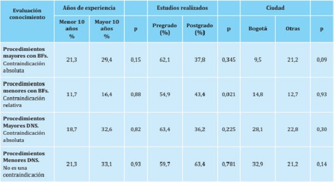 En el análisis de subgrupos se evidenció que una menor proporción de profesionales con estudios de postgrado consideraron el uso de bisfosfonatos una contraindicación relativa para la realización de procedimientos menores (43,4 vs 54,9%, p 0,021) (tabla 3). Para las demás decisiones clínicas, no se encontraron diferencias significativas, independientemente de los años de experiencia, el nivel de educativo (pregrado completo vs postgrado) o la ciudad en donde se realizaba la práctica profesional.