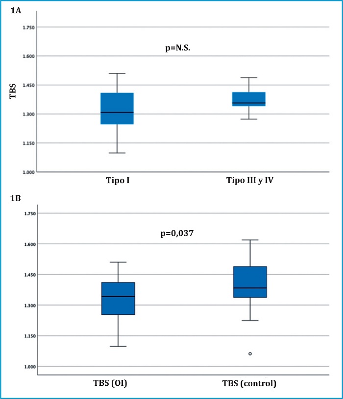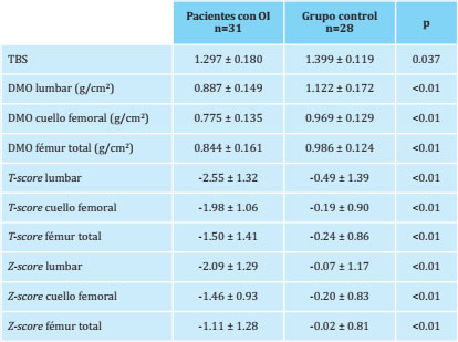 Resultados: La mayoría de los pacientes (29/31, 94%) tenían antecedentes de fracturas y el 29% recibía tratamiento antiosteoporótico. El 61% tenía una osteoporosis densitométrica y el 19% tenían una microarquitectura degradada. No se observaron diferencias en los valores del TBS según la gravedad de la OI (OI tipo I vs. III-IV: 1.297 vs. 1.339, p=n.s.); ningún paciente con OI tipo III-IV tenía TBS<1.230. Los valores de TBS se relacionaron con la edad (r=-0.6, p<0.01), la DMO lumbar (r=0.4, p=0.03) y el IMC (r=-0.5, p=0.01). Los pacientes con OI tenían valores más bajos de TBS y DMO que el grupo control en todas las localizaciones analizadas.