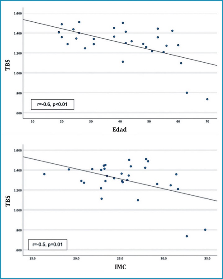 Los valores del TBS se relacionaron de forma positiva con la DMO lumbar (r=0.4, p=0.03), y de forma negativa con la edad (r=‐0.6, p<0.01) y el IMC (r=‐0.5, p=0.01) (figura 2).