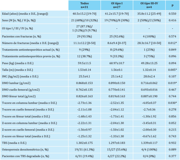 Material y métodos: Estudio transversal realizado en 31 pacientes adultos con OI (edad 40.5±15.2 años, 68% mujeres, 87% tipo I). Se analizaron las características clínicas de los pacientes (fracturas, tipo de OI, IMC y tratamiento), la densidad mineral ósea (DMO) (mediante DXA), valorando la presencia de osteoporosis densitométrica, y los valores de TBS (TBS iNsight), estimando la presencia de microarquitectura degradada (valores <1.230). Los resultados se compararon entre los diferentes tipos de OI (I y III-IV) y con los de un grupo control de sujetos sanos.