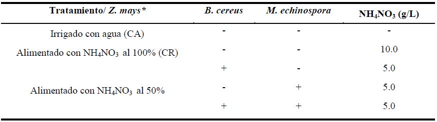Un ejemplo de este hecho, fue en invernadero la respuesta positiva de Z. mays en los valores de la fenología y biomasa, cuando se inoculo con Azotobacter sp. y Bacillus megaterium9, registrándose valores numéricos estadísticamente distintos comparados con los de respuesta de Z. mays con control relativo (CR). Con base a lo anterior el objetivo de esta investigación fue analizar el crecimiento de Z. mays inoculado con B. cereus y/o M. echinospora a la dosis 50% del FENI.