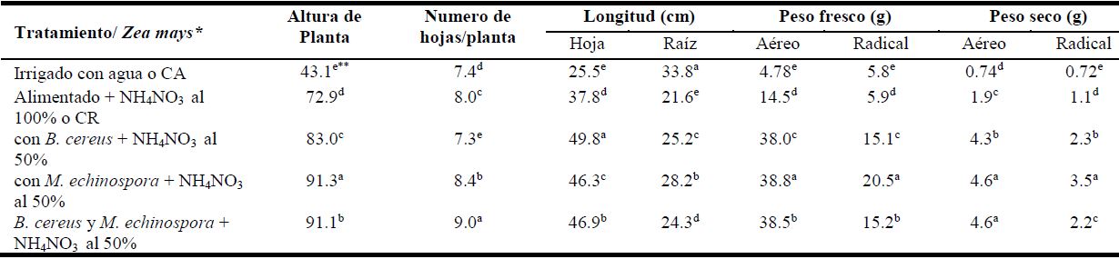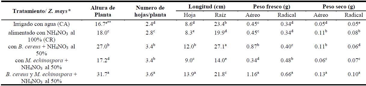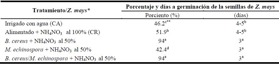 Los datos expuestos en la tabla 2 señalan que Z. mays inoculada solamente con B. cereus y en combinación con M. echinospora y el NH4NO3 al 50%, redujo el tiempo de emergencia de las semillas de Z. mays aumentando su porcentaje de crecimiento, la literatura refiere si las semillas se embebieron con agua reactivaron actividad enzimática de la α-amilasa que cataliza la hidrolisis de almidón, liberando ácidos orgánicos, aminoácidos, azucares y vitaminas derivadas de la degradación del endospermo, cuando esta gama de compuestos se liberan al exterior afectan positivamente la actividad y crecimiento de los microorganismos asociados a las semilla, denominándose espermatosfera15,17,18,31, mientras su liberación durante el crecimiento de la raíz, al exterior afectan positivamente la actividad y reproducción de las BAPOCEVE efecto denominado rizosfera13,14,15 de esta forma B. cereus transformo estos exudados de la espermósfera en SUPOCEVE, lo que sugiere, M. echinospora podría invadir el interior de las semilla de Z. mays señalando también que es posible convertir estos exudados en fitohormonas y terminar con la latencia para la aparición de la plantula.6,16,17
