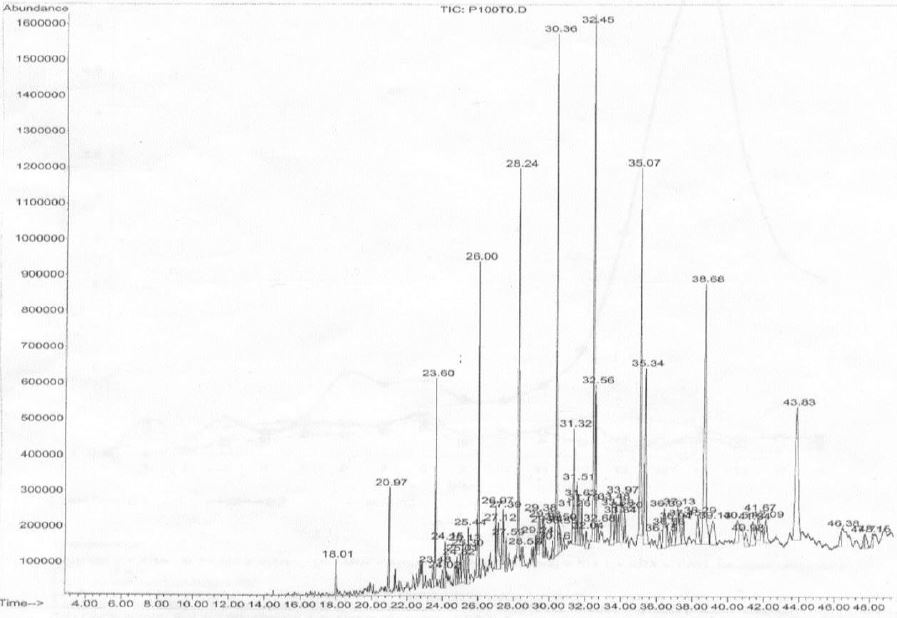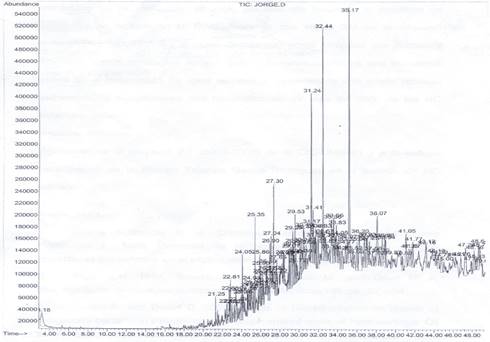 La figura 3 describe el perfil cromatográfico al inicio de la BIS en suelo contaminado por 75000 ppm de ARA, los picos de elución tuvieron tiempos que señalan compuestos de la fracción alifática, algunos con 12 a 35 carbonos que indicaron la existencia de dodecano, tetradecano, octadecano y eicosano. Además se detectaron alifáticos ramificados como: el pristano y el fitano, así como aromáticos del tipo: benceno, fenol, benzoantraceno, metildifenilo y naftaleno.