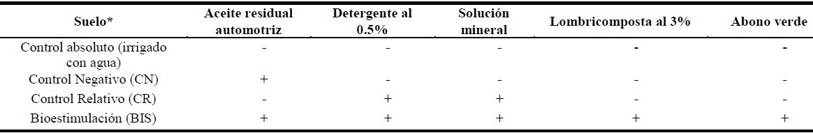 El aceite residual automotriz (ARA), una mezcla de hidrocarburos (HICO) alifáticos, aromáticos y trazas de metales pesados,1,2 que de acuerdo con la Ley General de Equilibrio Ecológico y Protección Ambiental (LGEEPA) se considera residuo peligroso para el ambiente.3 El ARA derramado en suelo forma una capa impermeable, bloqueando la difusión de O2 (oxigeno) y agua,4 causando un desequilibrio en la relación C:N (carbono/nitrógeno), que inhibe la actividad de la microbiota heterotrófica aerobia autóctona (MHAA) que oxida la materia orgánica (MO), y como consecuencia reduce la productividad agricola.5,6 Al respecto la NOM-138-SEMARNAT /SSA-2012,7 establece un límite máximo permisible de 4400 ppm de HICO, fraccionada en: 200 fracción ligera, 1200 mediana 1200 y 3000 ppm pesada. Un valor superior a 4400 ppm en suelo, esta ley, recomienda la aplicación de métodos químicos: O3 (ozono), H2O2 (peróxido de hidrogeno), Cl (cloro) y ClO2 (dióxido de cloro), que causan a su vez un daño colateral y elevado costo. Una alternativa ecológica a esta problemática que disminuya la concentración del ARA a concentración menor a la máxima aceptada por la NOM-138, la bioestimulación (BIS) del suelo impactado por ARA mediante un detergente (DEGE) que lo emulsifica,8 seguida de H2O2 o fuente de O2 (oxigeno) para acelerar su oxidación9 con enriquecimiento de una solución mineral (SOMI) a base de sales de NH4+, NO3- y PO4-3 que equilibrarían el desbalance de la relación C:N por el exceso de ARA e inducen a la microbiota a su oxidación,10,11 a continuación una BIS que mantenga la mineralización de la mezcla de HICO mediante una lombricomposta (LOCO) que incorporen com puestos orgánicos de N como la urea, aminoácidos, entre otros, y de MO almidón y glucosa que favorecen por cometabolismo a la oxidación del ARA.12 Posteriormente en el suelo la BIS mediante la siembra de Phaseolus vulgaris (frijol) y de Vicia sativa (janamargo) en estadio de plántula, se incorpora como abono verde (AVE) que se degradan para generar aminoácidos, nucleótidos y urea, al igual que azucares sencillos como glucosa, para mantener el cometabolismo de compuestos aromáticos policíclicos del ARA.3,13,14 En suelo impactado por este ARA una manera de facilitar la siembra de P. vulgaris y V. sativa es potenciarlo con Micromonospora echinospora y/o Penicillium chrysogenum para minimizar al estrés causado por la fitotoxicidad del ARA, principalmente porque ambos microorganismos oxidan los componentes aromáticos del ARA.15,16 Con base en lo anterior, el objetivo de este trabajo fue analizar la dinámica de BIS de un suelo impactado por 75000 ppm de ARA, y reducirlo a un valor inferior al máximo permisible por la NOM-138.