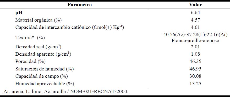 En la tabla 2 señala las propiedades fisicoquímicas del suelo previo a la contaminación por el ARA a pH de 6.64 ligeramente acido, con una concentración de MO de 4.57% o una moderada cantidad de carbono orgánico, de textura clasificada como franco-arcillosa-arenosa o: arcilla 22.16%, limo 37.28% y arena 40.56%.