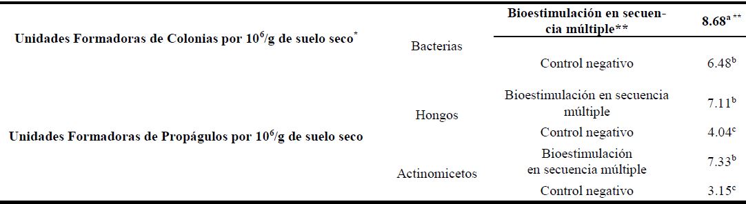 En la tabla 3, se presenta la BIS en secuencia de un suelo impactado por ARA, la densidad bacteriana heterotrófica aerobia oxidante de ARA registró 8.68x106 UFC/g de suelo seco, valor numérico estadísticamente diferente comparado con la densidad bacteriana de 6.48x106 UFC/g del suelo seco impactado por ARA sin BIS o CN, mientras que de los hongos oxidantes de ARA se registró una densidad de 7.11x106 UFP/g de suelo seco, valor numérico estadísticamente diferente comparado con la densidad de los hongos de 4.04x106 UFP/g en el suelo sin BIS, impactado por ARA o CN. En relación a los actinomicetos se detectaron 7.33x106 UFP/g valor numérico estadísticamente distinto a la densidad de los actinomicetos de 3.15 x106 UFP/g suelo seco en el impactado por ARA, sin BIS o CN.