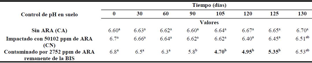 En la tabla 4, se detalla la dinámica del pH durante la BIS secuencia del suelo impactado por 2752 ppm de ARA. Ahí se registró una disminución del pH desde 6.8 en el día cero hasta a 4.70 en el día 105, la caída de pH o acidificación del suelo inhibió la mineralización del ARA, por lo que se neutralizo con Na2CO3 cada 5 días, para restaurar y mantener el valor original de 6.64, comparado con el suelo impactado por ARA sin BIS o CN, ahí se registró una mínima variación de 6.7 en el día cero hasta 6.51 al día 130.