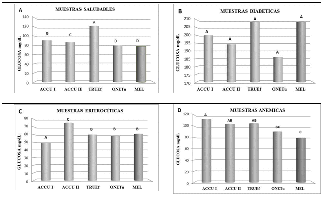 El presente estudio tuvo como objeto determinar la utilidad de glucómetros en relación al método de laboratorio estándar (MEL) en muestras sanguíneas: saludables, diabéticas, eritrociticas y anémicas. Los GM más usados que se encuentran en mercado son ACCU CHEK Active (ACCU), ONE TOUCH Ultra (ONETu) y TRUEread facíl (TRUEf).