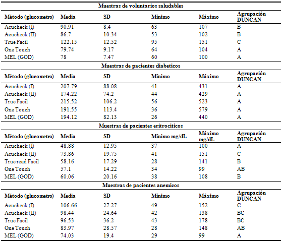 Resumen: El objetivo de este estudio fue determinar la utilidad de glucómetros en relación al método de laboratorio estándar (MEL) en muestras sanguíneas: saludables, diabéticas, eritrociticas y anémicas. Los glucómetros (GM) evaluados fueron ACCU CHEK Active en sus dos procedimientos (ACCU I y ACCU II), ONE TOUCH Ultra (ONETu) y TRUEread fácil (TRUEf). Se utilizó el análisis de varianza ANOVA, p<0.005. De 54 muestras saludables con hematocrito 49±4, ONETu no expuso diferencia significativa con MEL, ACCU I, ACCU II y TRUEf expusieron diferencias significativas, siendo TRUEf el que reveló mayor diferencia con valores sobreestimados en más de 30 mg/dL. De 60 muestras diabéticas con hematocrito 48±8, no hubo diferencias significativas entre los GM y MEL, sin embargo se detectaron resultados incongruentes de 2 a 3 veces sobreestimados (13%) y de 2 a 3 veces infravalorados (12%) con los GM ONETu y TRUEf; ACCU I y ACCU II expusieron incongruencias leves. De 54 muestras eritrociticas con hematocrito 66±6, se detectaron valores infravalorados en 20 mg/dL con ONETu y TRUEf (10%), ACCU I (18%); ACCU II reporto valores sobreestimados entre 15-25 mg/dL (40%) con diferencia estadística significativa. De 40 muestras anémicas con hematocrito 29±9, se reportó valores sobreestimados, 20% (ONETu), 35% (TRUEf), 45% (ACCU II) y 55% (ACCU I), con una diferencia mayor a 20 mg/dL. Los GM evaluados presentan diferentes grados de interferencia por muestras diabéticas, anémicas y eritrociticas, en el caso de muestras eritrociticas se observan valores infravalorados, en muestras anémicas valores sobrevalorados, estos datos deben ser considerados para un mejor uso de los GM.