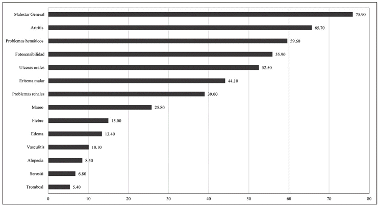 Los signos y síntomas más frecuentemente reportados por los pacientes en el transcurso de su enfermedad fueron: malestar general (75.9%), artritis (65.7%), problemas hemáticos (59.6%), ulceras orales (52.5%), eritema malar (44.1%) y problemas renales (39%). En una mayoría de los casos la afección inicial fue multisistémica (más de un signo o síntoma clínico a la vez), lo que dificultó su diagnóstico inicial.